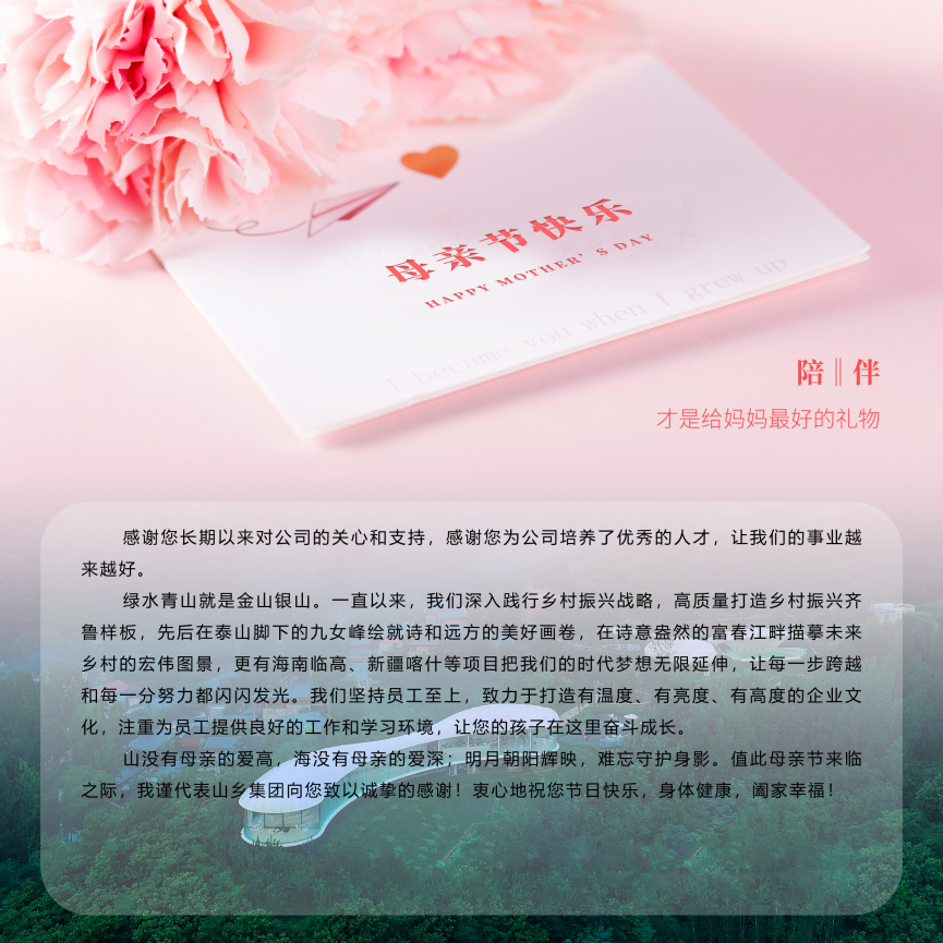 濃情五月,感恩母愛。母親節(jié)來臨之際,山鄉(xiāng)集團有限公司(簡稱“山鄉(xiāng)集團”)工會組織“以愛之名·感恩有您”活動致愛母親節(jié)。工會為員工母親寄送康乃馨花束,山東文旅集團首席戰(zhàn)略官,山鄉(xiāng)集團黨委書記、董事長張建峰致信每一位員工的母親表達節(jié)日祝福。