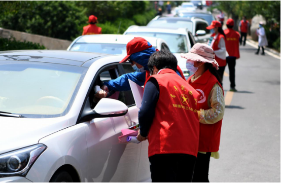 在九女峰游客接待中心附近,數(shù)十名志愿者為前往度假區(qū)的游客一一登記并測量體溫,車輛排出了綿延數(shù)百米的長龍。