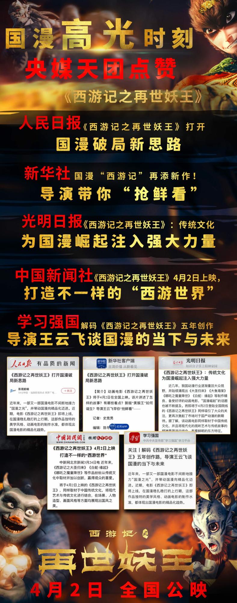 4月2日,由山東文旅投資集團(tuán)、山東省文化基金等聯(lián)合投資出品的動漫電影《西游記之再世妖王》在全國各影院隆重上映。該影片憑借其在承接傳統(tǒng)文化基礎(chǔ)上升級打造的新穎劇情、高品質(zhì)的觀感音效,以及燃炸、溫情、歡樂的中國風(fēng)元素,吸引了各年齡段觀眾前往觀影,上映三日以來累計(jì)票房已突破6200萬元,票房占比持續(xù)攀升,媒體、觀眾好評如潮。包括新華網(wǎng)、人民日報、光明日報、中國新聞社、學(xué)習(xí)強(qiáng)國在內(nèi)的多家央媒紛紛發(fā)文,點(diǎn)贊國漫崛起,對主創(chuàng)團(tuán)隊(duì)傳承創(chuàng)新傳統(tǒng)文化的匠心努力給予了充分肯定,稱影片是一部兼具中國傳統(tǒng)文化底色與視聽語言創(chuàng)新、兼顧趣味性與思想深度、具有鮮明東方特征的合家歡國漫精品。