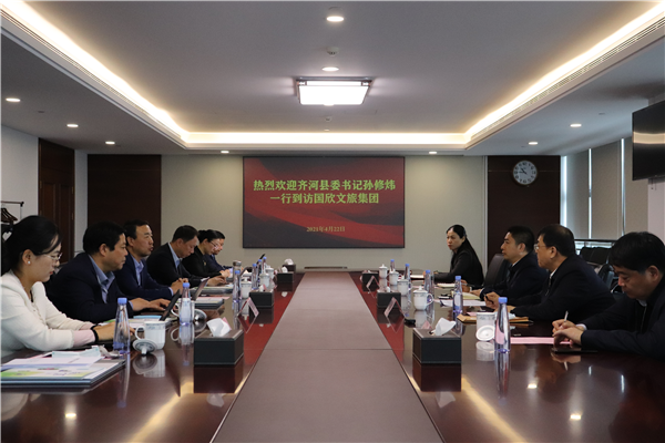 4月22日上午,魯商集團黨委書記、董事長兼山東省國欣文化旅游發(fā)展集團有限公司(簡稱“國欣文旅”)黨委書記、董事長高洪雷與到訪的德州市齊河縣委書記孫修煒一行座談交流。國欣文旅黨委副書記、總經(jīng)理丁藝參加。