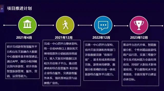 根據(jù)整體規(guī)劃,“好客山東 云游齊魯”智慧文旅項(xiàng)目將分三年建設(shè)完成。今年4月底前,初步完成游客智慧服務(wù)平臺(tái)和山東智慧文旅融合大數(shù)據(jù)中心數(shù)據(jù)庫(kù)基本框架建設(shè),通過(guò)微信小程序、公眾號(hào)觸達(dá)國(guó)內(nèi)外游客;12月底前,完成“一中心四平臺(tái)”整體架構(gòu),統(tǒng)一全省4A級(jí)以上景區(qū)和博物館票務(wù)分銷(xiāo)核銷(xiāo)系統(tǒng)接口;2022年12月底前,山東省內(nèi)文旅資源和各級(jí)各部門(mén)涉旅數(shù)據(jù)資源“應(yīng)接盡接”;2023年12月底前,推動(dòng)平臺(tái)功能迭代升級(jí),擴(kuò)大新技術(shù)場(chǎng)景應(yīng)用,全面實(shí)現(xiàn)平臺(tái)建設(shè)總體目標(biāo)。