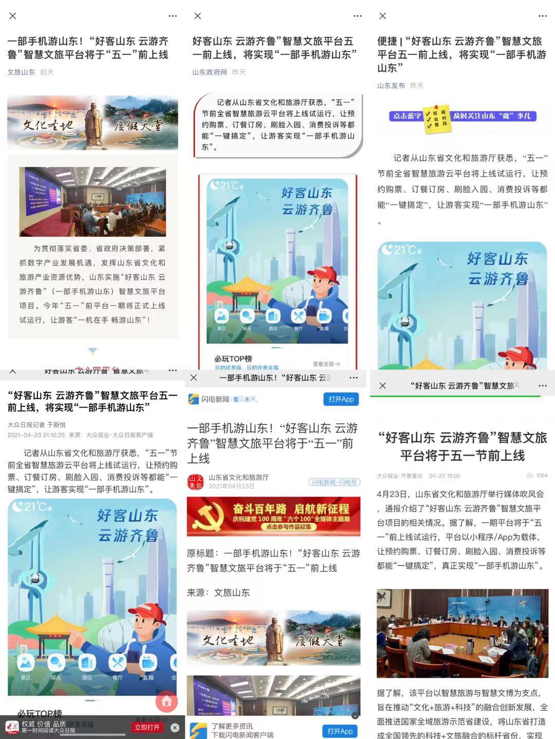 (文旅山東、山東政府網(wǎng)、山東發(fā)布等微信公眾號(hào)和大眾日?qǐng)?bào)、海報(bào)新聞、齊魯壹點(diǎn)等客戶(hù)端和推文)