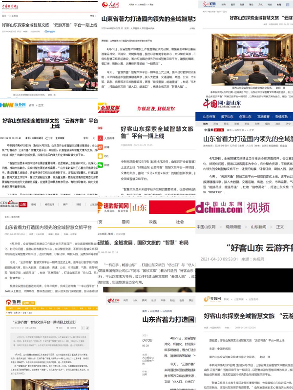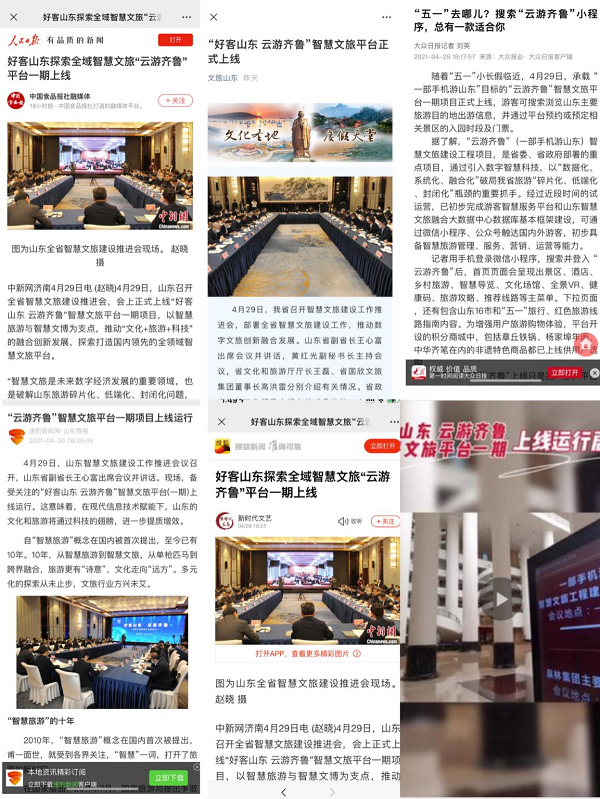 經(jīng)過(guò)先期預(yù)熱,智慧文旅平臺(tái)的上線吸引了大眾和媒體的關(guān)注。截至4月30日下午,魯網(wǎng)監(jiān)測(cè)到與“智慧文旅平臺(tái)上線”有關(guān)的新聞報(bào)道696篇。中國(guó)新聞網(wǎng)發(fā)布原創(chuàng)稿件《好客山東探索全域智慧文旅“云游齊魯”平臺(tái)一期上線》,山東衛(wèi)視《新聞聯(lián)播》重磅播報(bào)《“好客山東 云游齊魯”智慧文旅平臺(tái)上線》,大眾日?qǐng)?bào)客戶端推出文章《“五一”去哪兒?搜索“云游齊魯”小程序,總有一款適合你》,文旅山東微信公眾號(hào)、齊魯壹點(diǎn)發(fā)文《“好客山東 云游齊魯”智慧文旅平臺(tái)正式上線》,山東商報(bào)在頭版、4-5版等版面刊發(fā)2篇文章《齊魯風(fēng)韻插上科技翅膀》《國(guó)欣文旅的“智慧”布局》。