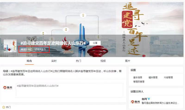 5月10日至14日,由中央網(wǎng)信辦網(wǎng)絡(luò)社會(huì)工作局、山東省委網(wǎng)信辦聯(lián)合主辦,山東文旅傳媒集團(tuán)所屬魯網(wǎng)承辦的“追尋建黨百年足跡——網(wǎng)絡(luò)名人山東行”活動(dòng)成功舉辦。微博話題#追尋建黨百年足跡網(wǎng)絡(luò)名人山東行#閱讀量突破2.6億!