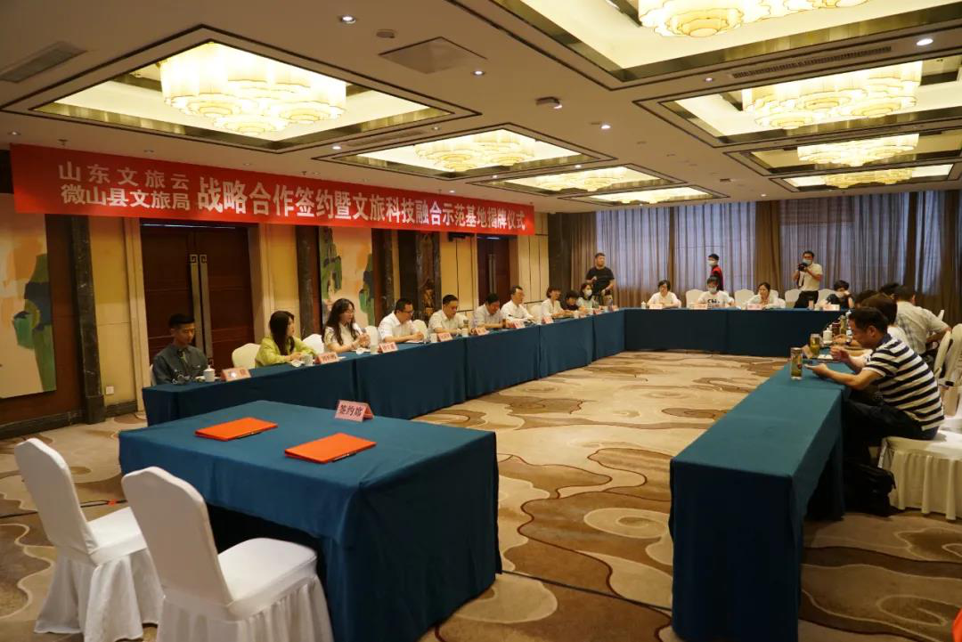 為響應(yīng)國家“科技+文旅”融合發(fā)展號召,發(fā)揮省級智慧文旅平臺優(yōu)勢,進(jìn)一步加強(qiáng)對微山湖旅游區(qū)資源的優(yōu)化整合,助力微山湖旅游區(qū)申創(chuàng)國家5A級旅游景區(qū),8月23日,微山縣文化和旅游局與山東文旅云智能科技有限公司(簡稱“文旅云公司”)戰(zhàn)略合作簽約暨文旅科技融合示范基地揭牌儀式在濟(jì)寧市微山縣舉行。微山縣政府黨組成員、南陽古鎮(zhèn)旅游管理服務(wù)中心主任李丙宏,國欣文旅黨委委員、副總經(jīng)理、山東文旅景區(qū)集團(tuán)黨委書記、董事長季將參加活動。