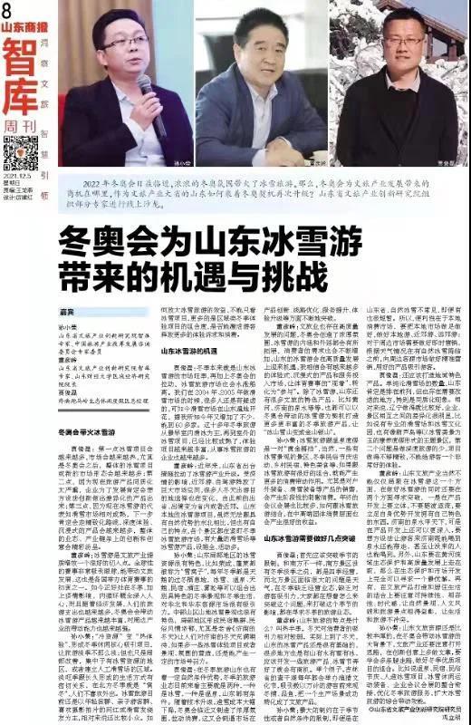 智庫版逢周日出版。首期關(guān)注了冬奧會話題和全域旅游概念。山東省文旅產(chǎn)業(yè)創(chuàng)新研究院智庫專家、中國旅游改革發(fā)展咨詢委員會專家委員孫小榮,山東省文旅產(chǎn)業(yè)創(chuàng)新研究院智庫專家、山東財(cái)經(jīng)大學(xué)區(qū)域經(jīng)濟(jì)研究院院長董彥嶺,濟(jì)南跑馬嶺生態(tài)休閑度假區(qū)總經(jīng)理賈俊磊等各抒己見,分析了冬奧會為山東冰雪游帶來的機(jī)遇和挑戰(zhàn)。