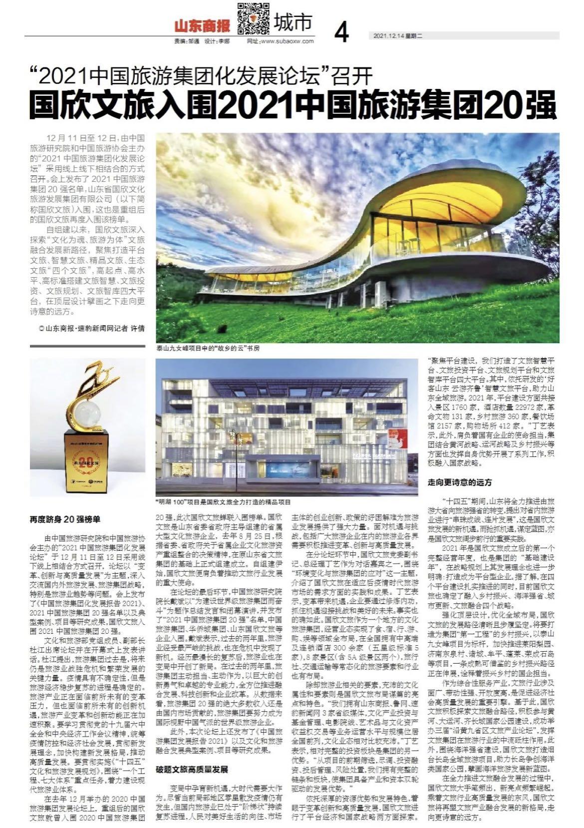 12月11日至12日,由中國旅游研究院和中國旅游協(xié)會主辦的“2021中國旅游集團化發(fā)展論壇”采用線上線下相結(jié)合的方式召開。會上發(fā)布了2021中國旅游集團20強名單,山東省國欣文化旅游發(fā)展集團有限公司(以下簡稱國欣文旅)入圍,這也是重組后的國欣文旅再度入圍該榜單。
