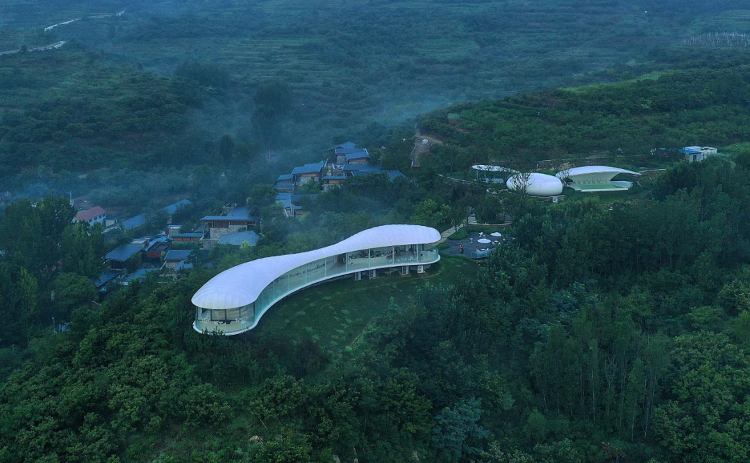 九女峰書房位于泰山·九女峰鄉(xiāng)村振興示范區(qū)故鄉(xiāng)的云民宿區(qū)域至高處,獨(dú)特的建筑動(dòng)線與起伏岑寂的山脈相呼應(yīng),像一朵云彩延綿無盡,有一種靜止的流暢感。