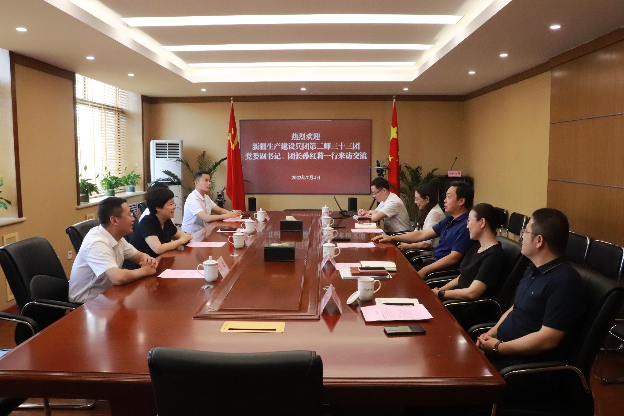 7月4日,新疆生產(chǎn)建設(shè)兵團(tuán)第二師三十三團(tuán)黨委副書記、團(tuán)長孫紅莉一行到訪山東文旅集團(tuán),集團(tuán)黨委委員、副總經(jīng)理喬衛(wèi)東參加交流座談。