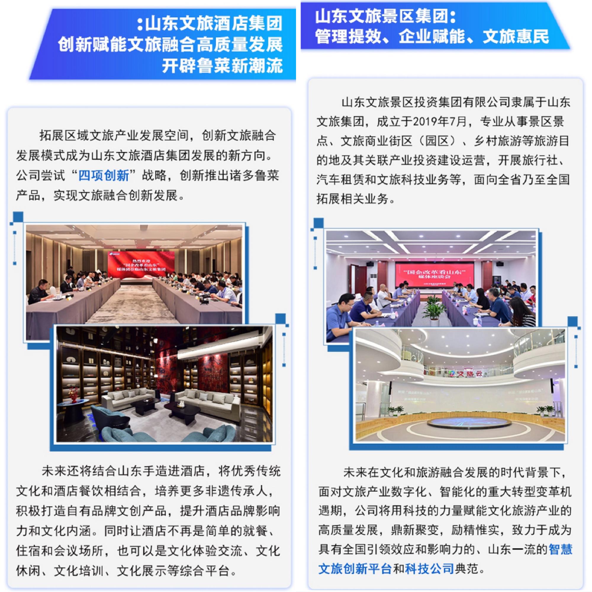 在泉城大酒店魯菜館,山東文旅集團首席客戶官,山東文旅酒店集團黨委書記、董事長李浩介紹了酒店板塊在弘揚魯菜文化和持續(xù)創(chuàng)新經(jīng)營舉措等方面的亮點做法。在文旅云公司,山東文旅景區(qū)集團黨委書記、董事長朱愛軍介紹了打造平臺企業(yè)和加快數(shù)字化轉(zhuǎn)型的成果。