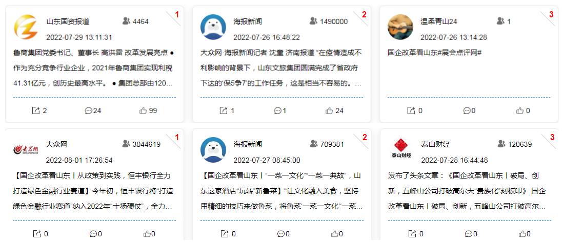 聚焦山東國企改革,包括人民日報、新華社、光明日報、經(jīng)濟日報、中國日報、科技日報、中國證券報·中證網(wǎng)、中國經(jīng)濟周刊、工人日報、中國青年報、中國發(fā)展改革報、中國旅游報、人民網(wǎng)、新華網(wǎng)、中國網(wǎng)、光明網(wǎng)、大眾日報客戶端、大眾網(wǎng)·海報新聞、齊魯網(wǎng)·閃電新聞、新浪、搜狐、今日頭條、抖音等央級、省級重點新聞媒體、商業(yè)網(wǎng)站、客戶端以及社交平臺的高度關(guān)注,多家主流媒體通過文字+圖片、文字+音視頻等報道形式,對活動進行全方位、立體式、多樣化報道,收到良好傳播效果。