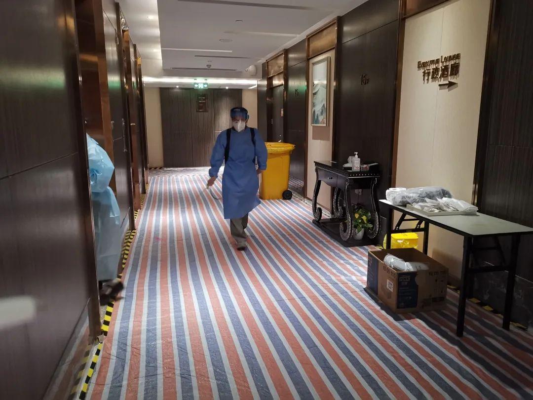 統(tǒng)籌組克服困難,用最短的時(shí)間將3600平方米的公區(qū)按照要求鋪設(shè)地膜進(jìn)行防護(hù);供餐組負(fù)責(zé)為醫(yī)護(hù)人員準(zhǔn)備一日三餐,在此次接待中累計(jì)制作盒飯15884份;保障組負(fù)責(zé)酒店后勤服務(wù)和安全保障工作,他們化身“環(huán)衛(wèi)大白”清理醫(yī)療垃圾;消殺組按照駐店醫(yī)療組專家的意見(jiàn),專人每天對(duì)各區(qū)域進(jìn)行三次消毒工作,累計(jì)消毒公區(qū)面積28萬(wàn)余平方米......