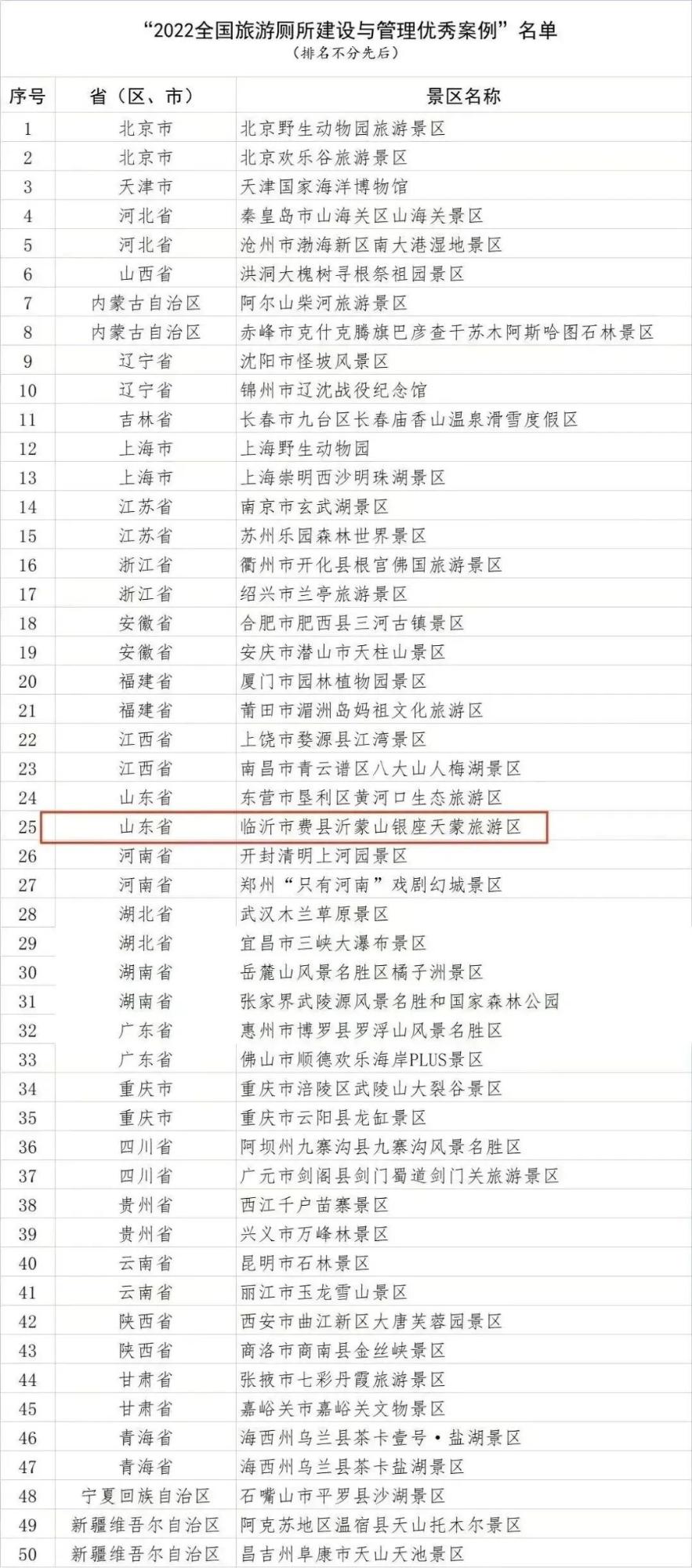 近日,國(guó)家文化和旅游部公共服務(wù)司公布了“2022全國(guó)旅游廁所建設(shè)與管理優(yōu)秀案例”名單,沂蒙山銀座天蒙旅游區(qū)位列其中。