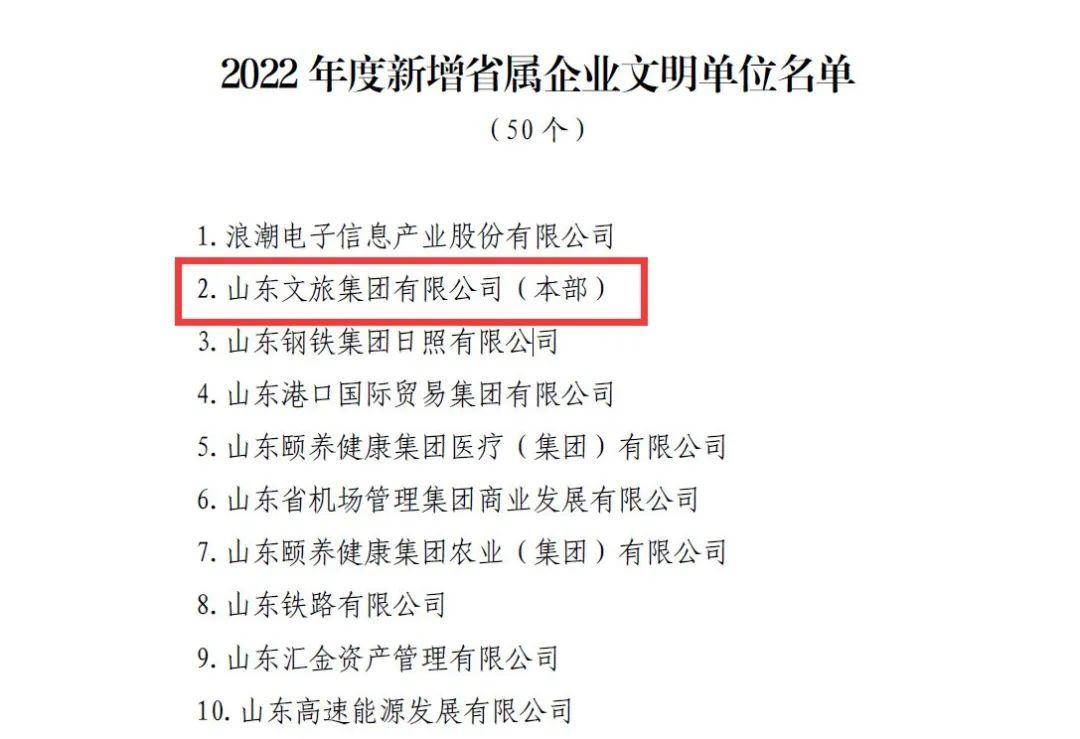 近日,山東省省屬企業(yè)精神文明建設(shè)委員會印發(fā)《關(guān)于命名表彰2022年度省屬企業(yè)文明單位的決定》(魯企文明委〔2022〕3號),山東文旅集團(本部)和山東文旅五峰山公司新獲“山東省省屬企業(yè)文明單位”稱號,至此集團省級、省屬企業(yè)文明單位增至14家。