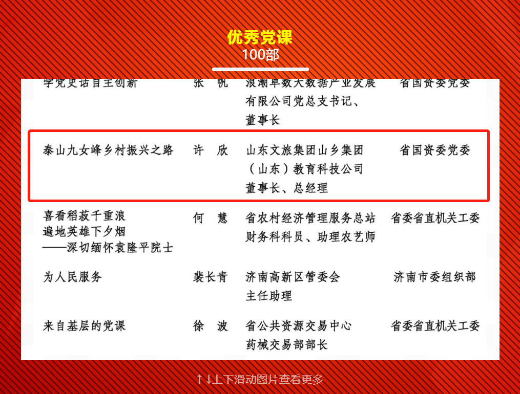 “腳下沾滿泥土,心中充滿熱愛”,山東文旅所屬山鄉(xiāng)集團優(yōu)秀黨員許欣,飽含深情地開啟了《泰山九女峰鄉(xiāng)村振興之路》的講述,黨課作品共分為“守初心·黨建引領(lǐng)”“敢擔(dān)當(dāng)·振興藍(lán)圖”“促發(fā)展·產(chǎn)業(yè)賦能”“走在前·齊魯樣板”四個章節(jié),設(shè)計巧妙、內(nèi)容豐富,將山東文旅鄉(xiāng)村振興故事娓娓道來,全面展示了山東文旅人牢記囑托走在前、勇?lián)姑_新局的勇氣和毅力,用每一次行動、每一個成功經(jīng)驗譜寫新時代文旅人的使命與擔(dān)當(dāng)。