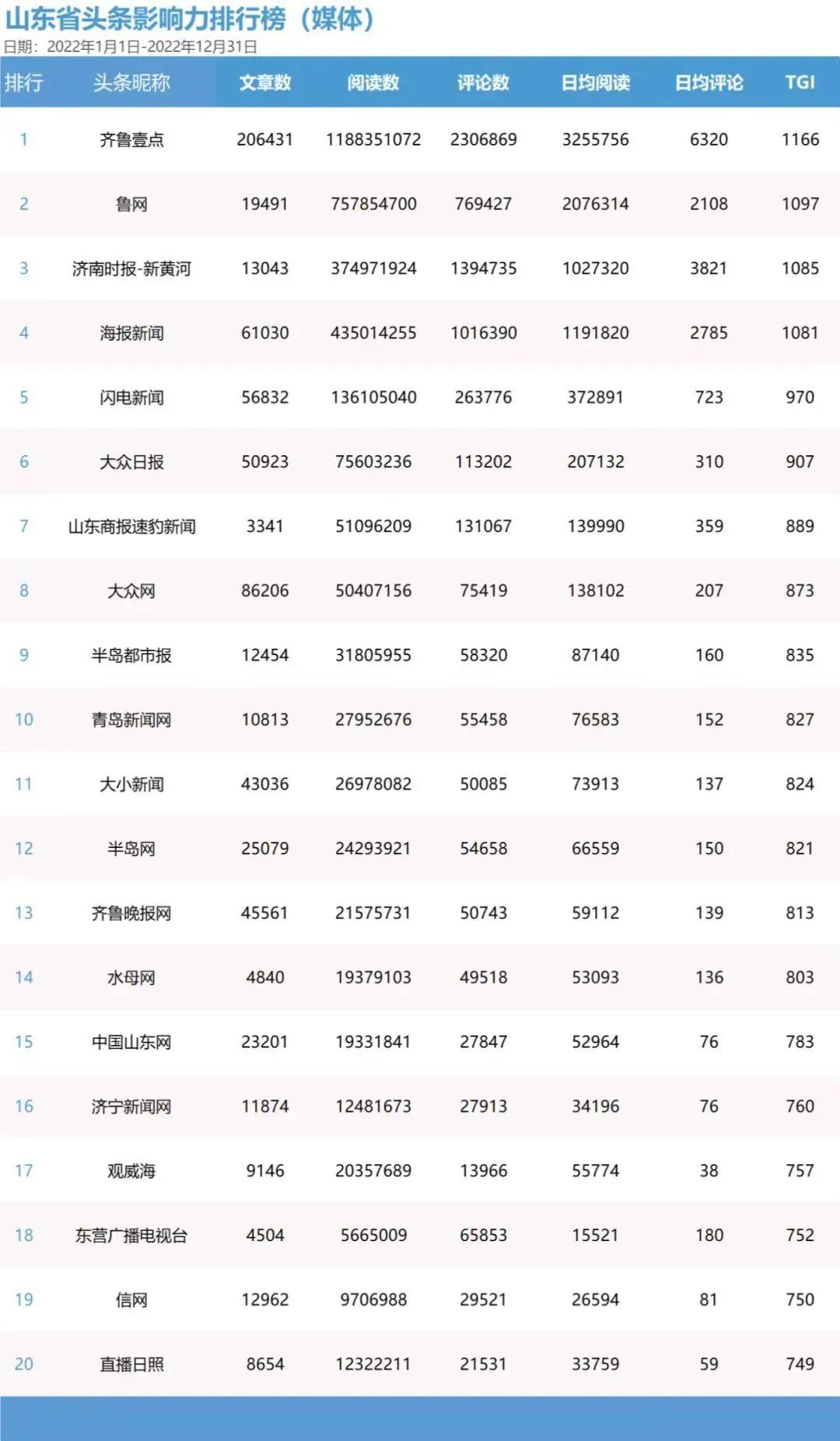 據(jù)了解,該榜單根據(jù)2022年1月1日至12月31日期間,山東省媒體賬號(hào)在今日頭條平臺(tái)上的發(fā)文數(shù)據(jù)和傳播數(shù)據(jù),綜合頭條號(hào)傳播指數(shù)(TGI)公式統(tǒng)計(jì)分析傳播影響力,并以此為依據(jù)得出該平臺(tái)最具傳播影響力的TOP20賬號(hào)。