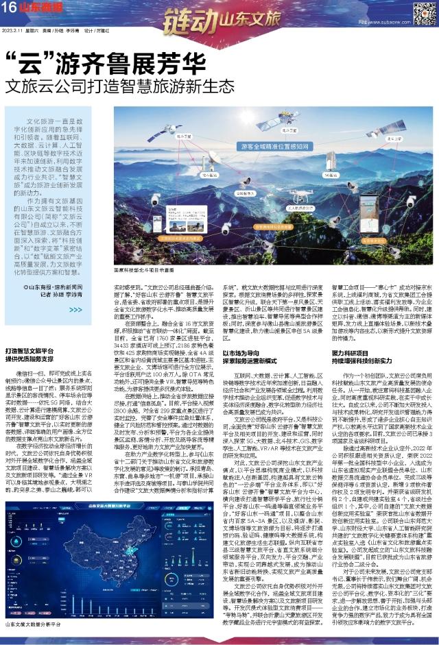 文旅云公司既是政府平臺,又是科技公司,全面負責(zé)“好客山東云游齊魯”智慧文旅平臺及相關(guān)項目的開發(fā)、建設(shè)和運營,同時深入探索5G、大數(shù)據(jù)、北斗技術(shù)、GIS、數(shù)字孿生、人工智能、VR/AR等技術(shù)在文旅產(chǎn)業(yè)的研發(fā)和應(yīng)用。