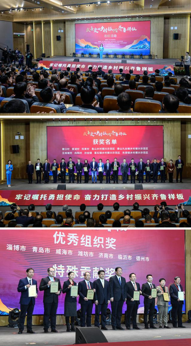 與會(huì)領(lǐng)導(dǎo)為入選的村(示范區(qū))和最佳組織獎(jiǎng)、特殊貢獻(xiàn)獎(jiǎng)?lì)C發(fā)證書。山鄉(xiāng)集團(tuán)打造的泰山九女峰鄉(xiāng)村振興示范區(qū)和濟(jì)南東泉鄉(xiāng)村振興項(xiàng)目成功入選,同時(shí),山鄉(xiāng)集團(tuán)獲得活動(dòng)特殊貢獻(xiàn)獎(jiǎng)。