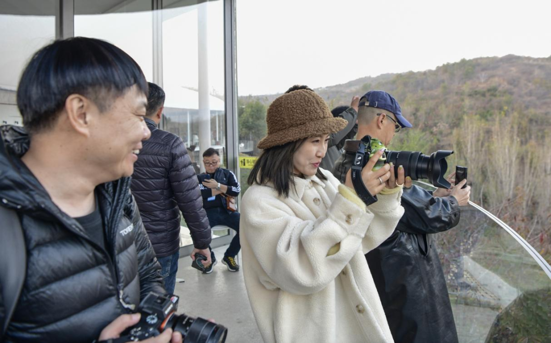 初冬的九女峰在靜謐中平添了一分清麗,朦朧薄霧間云月相伴的勝景令人流連忘返。伴隨著講解員的介紹,網(wǎng)絡(luò)名人們沿著山路拾級而上,不時駐足停留,掏出手機拍照打卡,記錄九女峰的醉人美景。