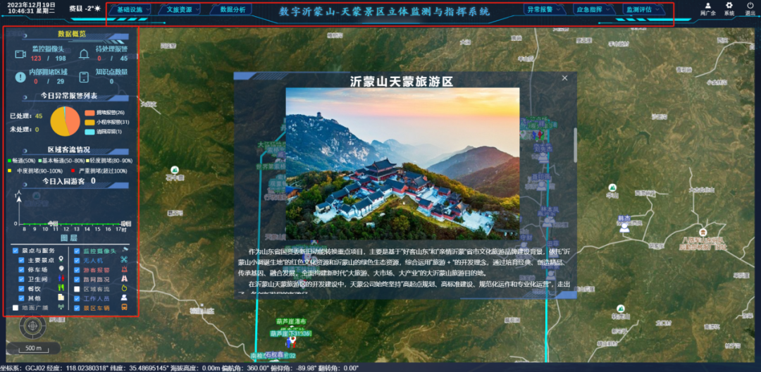 2023年10月20日,國家重點研發(fā)計劃“復雜山岳景區(qū)游客全域位置感知與精準服務”應用運行啟動儀式在天蒙景區(qū)舉辦。經(jīng)過兩個多月的應用實踐,北斗項目研究成果“數(shù)字沂蒙山-天蒙景區(qū)立體監(jiān)測與指揮系統(tǒng)”及“天蒙導覽微信小程序”取得了顯著的成果。