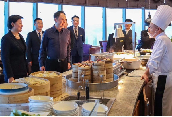 丁藝詢問了怡豪大飯店更名后的運營情況,并對自有高端品牌的推出以及相關經(jīng)營管理工作予以肯定。在實地考察過程中,丁藝一行參觀了大堂、客房、宴會廳、銀頂旋轉(zhuǎn)餐廳等主要經(jīng)營部位,重點檢查了消防、電梯等安全設施,并對下一步工作提出具體要求。