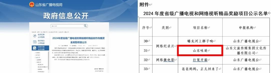 近日,山東省廣播電視局組織開展2024年度省級廣播電視和網(wǎng)絡(luò)視聽精品創(chuàng)作傳播資金獎勵項目的申報、評選工作。由山東省商務(wù)廳、山東文旅集團(tuán)出品,山東文旅傳媒集團(tuán)、山東文旅傳媒集團(tuán)文化傳播有限公司、山東映訊文化傳播有限公司聯(lián)合出品的山東風(fēng)味系列美食紀(jì)錄片《山東味道》在眾多申報項目中脫穎而出,入選2024年度省級廣播電視和網(wǎng)絡(luò)視聽精品創(chuàng)作傳播資金獎勵項目。