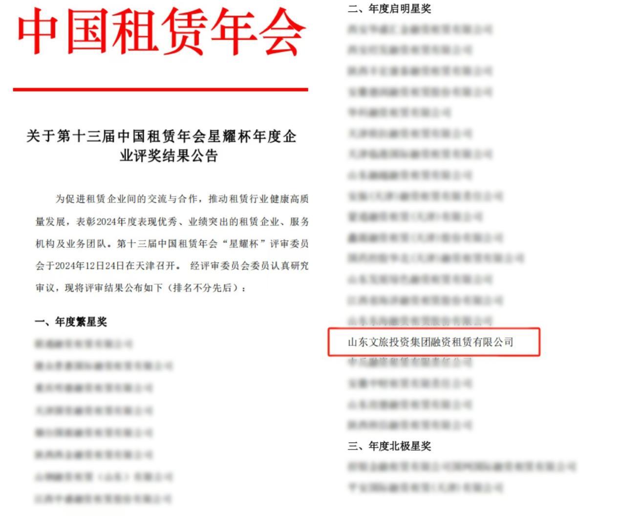 近日,中國租賃年會評審委員會發(fā)布了《關(guān)于第十三屆中國租賃年會星耀杯年度企業(yè)評獎結(jié)果公告》,經(jīng)評審委員會評審,山東文旅投資集團(tuán)融資租賃有限公司(以下簡稱“文旅租賃”)獲評“年度啟明星獎”。