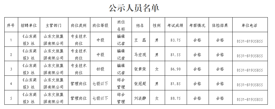 根據(jù)中共山東省委組織部、山東省人力資源和社會(huì)保障廳《關(guān)于印發(fā)2024年度省屬事業(yè)單位公開(kāi)招聘工作實(shí)施方案的通知》(魯人社發(fā)〔2023〕14號(hào))和《<山東商報(bào)>社2024年公開(kāi)招聘工作人員簡(jiǎn)章》等相關(guān)規(guī)定,按照崗位招聘計(jì)劃,《山東商報(bào)》社組織完成了公開(kāi)招聘工作人員考試、考察、體檢等工作,現(xiàn)將擬聘用人員進(jìn)行公示。公示期為7個(gè)工作日,自2024年12月11日至2024年12月19日(不含節(jié)假日)。公示期間,如對(duì)公示人選有異議,請(qǐng)以書(shū)面、實(shí)名形式向山東文旅集團(tuán)有限公司反映。